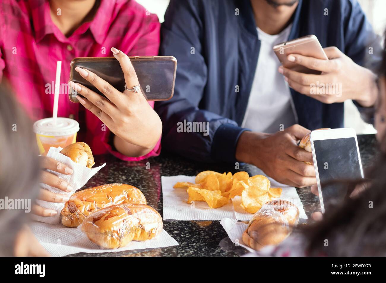 Group Of Unrecognizable People Busy On Mobile While Having Snacks Together At Restaurant Concept Of Millennials Having Junk Food Phone Addiction Stock Photo Alamy